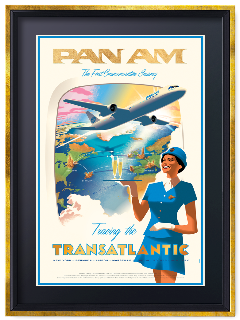 This commemorative poster artwork celebrates the return of the Pan Am brand to the skies for the first time in the 21st century. The 12-night voyage has been created to relive the golden age of travel, taking in some of the destinations on the airline’s first scheduled flights. The poster is inspired by the iconic blue of Pan Am, also featuring the Boeing Clipper, a professional cabin crew member bearing the specific champagne flutes created for the brand against an evocative, vintage-style bright colour palette and a map of those early transatlantic flights.