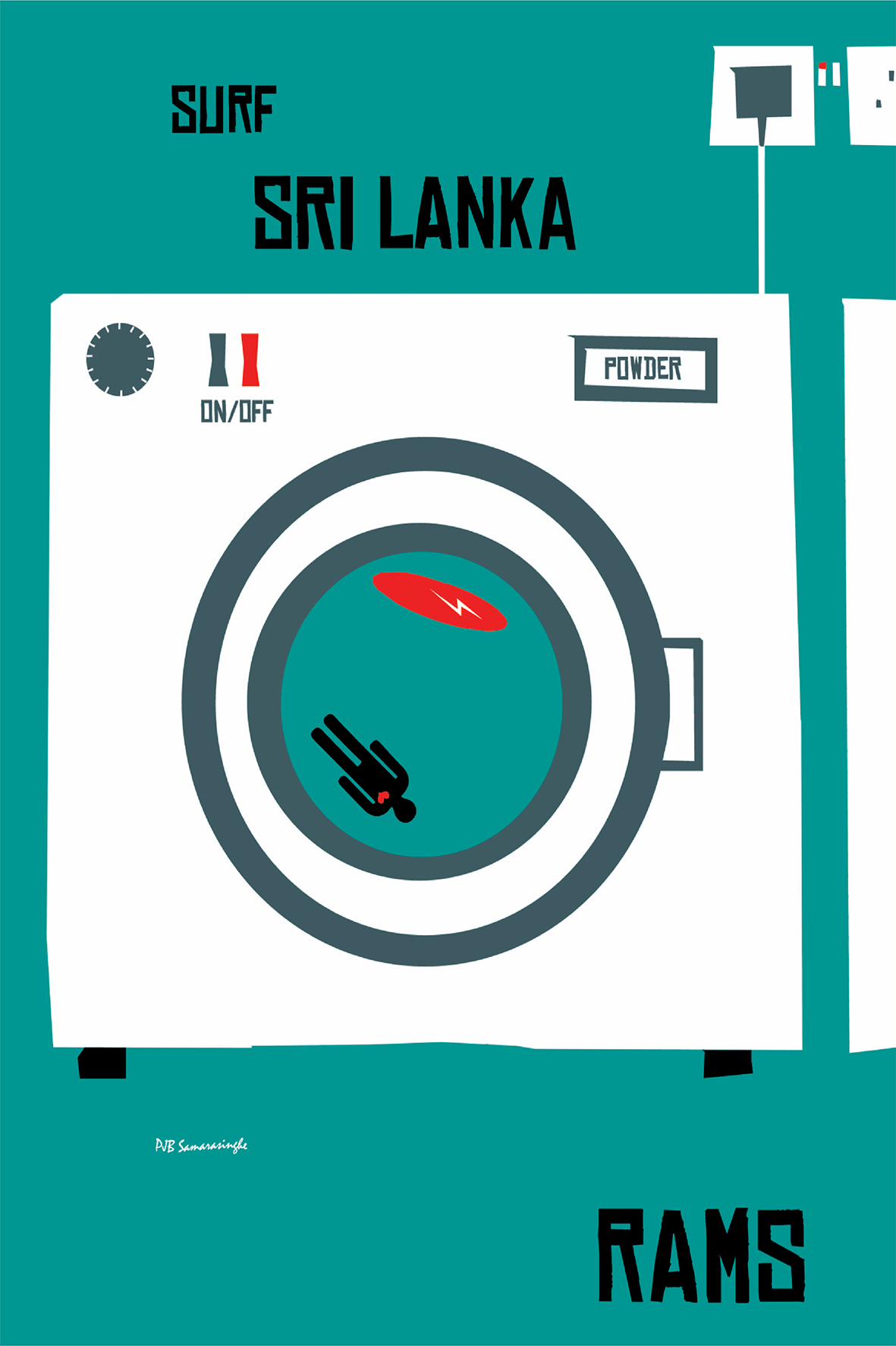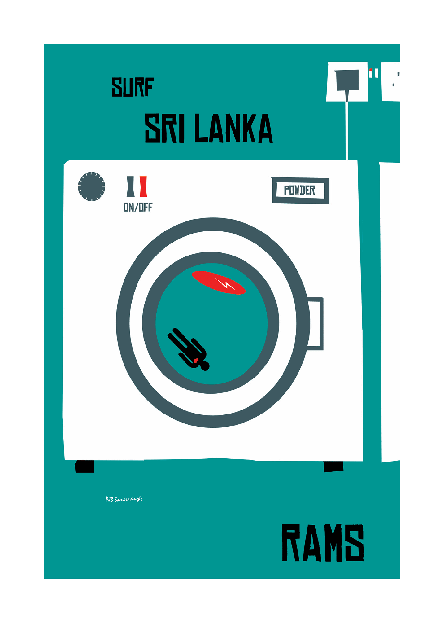 Stick No Bills presents a stunning poster inspired by the vibrant 1990s culture of Sri Lanka, featuring a washing machine with the outline of a person and a surfboard inside. The person's red heart is illuminated, while the surfboard is all red with a lighting outline on top, all set against a turquoise background. Perfect for buyers seeking a unique and eye-catching piece of art that captures the essence of the island's lively spirit. Order yours today!