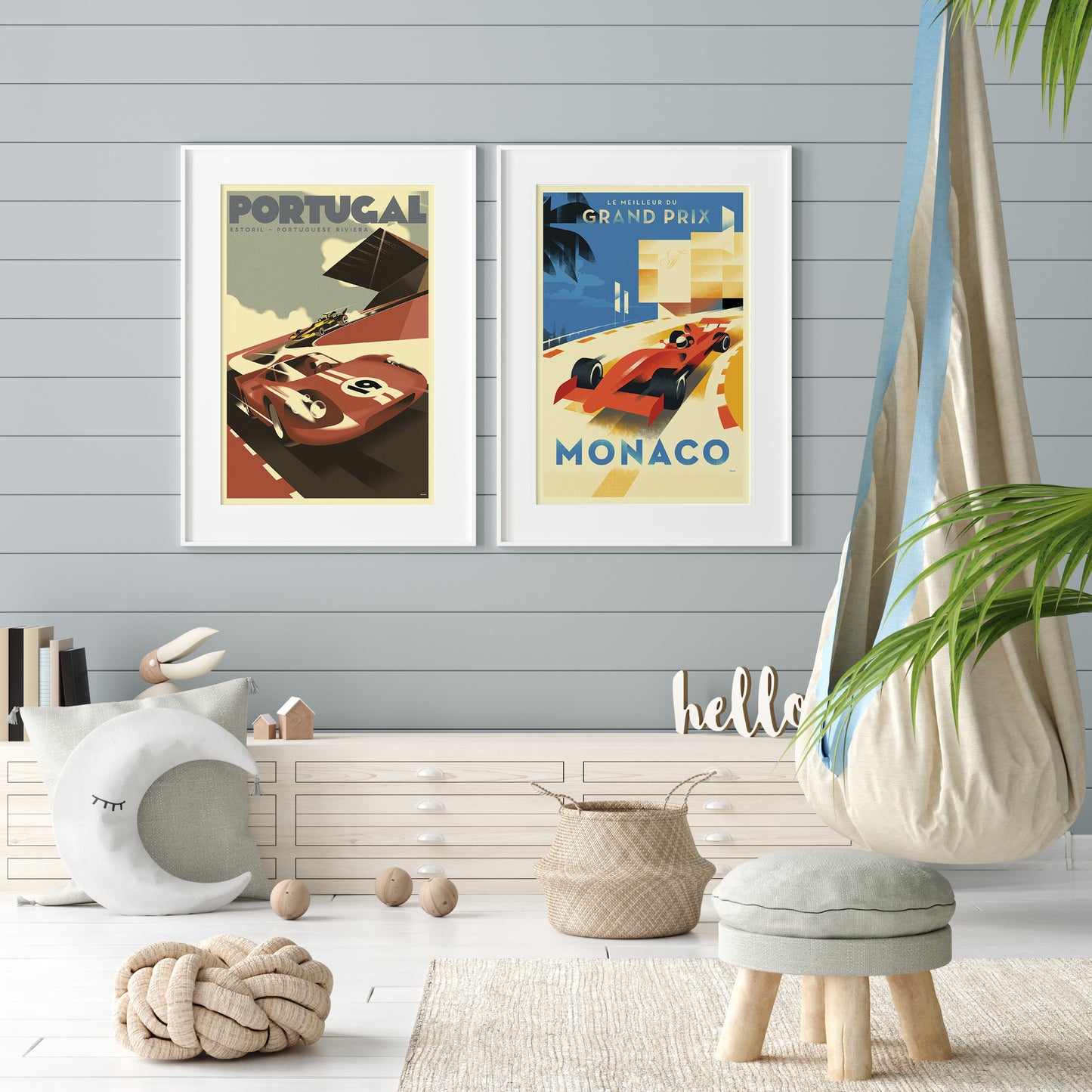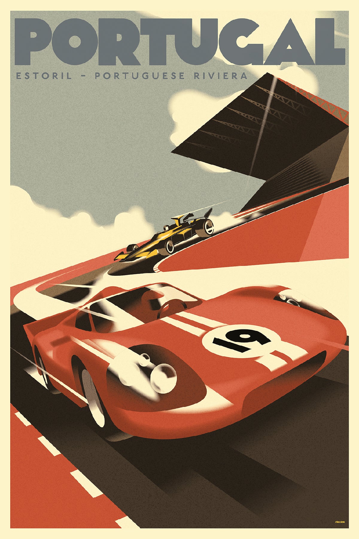 Looking for vintage posters? Discover Stick No Bills' collection of stunning racing car posters! This poster showcases a red racing car on a Portuguese circuit, complemented by lively reds and greys. With a yellow racing car in the background, this poster is perfect for any racing enthusiast. Shop now!