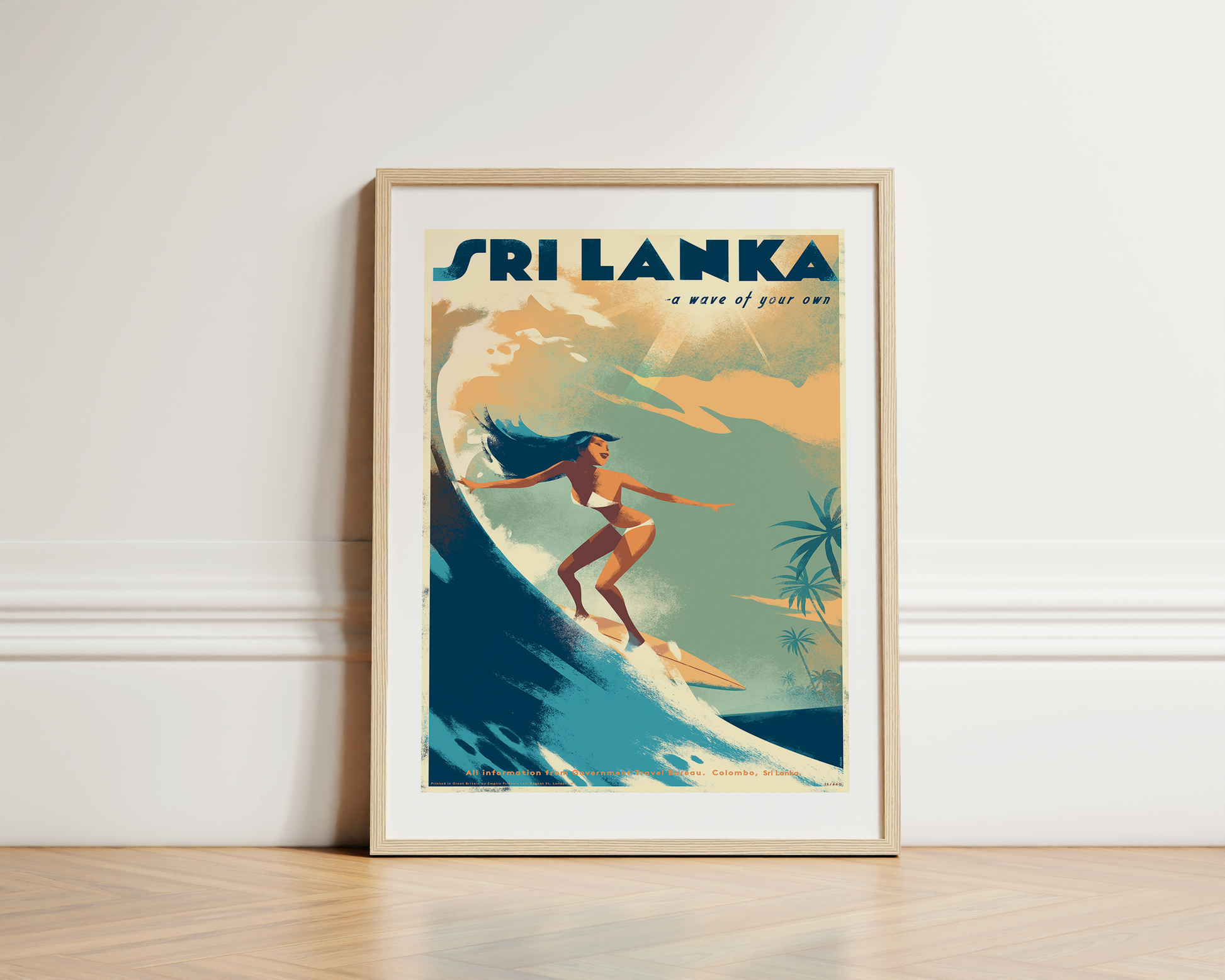 Capture the thrill of catching a wave with this stunning surf poster! Showing speed, freedom and adrenaline, it embodies the essence of surfing. This image of a female surfer in the Indian Ocean is one of our all-time favourites, while also supporting wildlife conservation in Sri Lanka. The perfect authentic poster artwork for surf and adventure-lovers alike, wherever in the world they are!