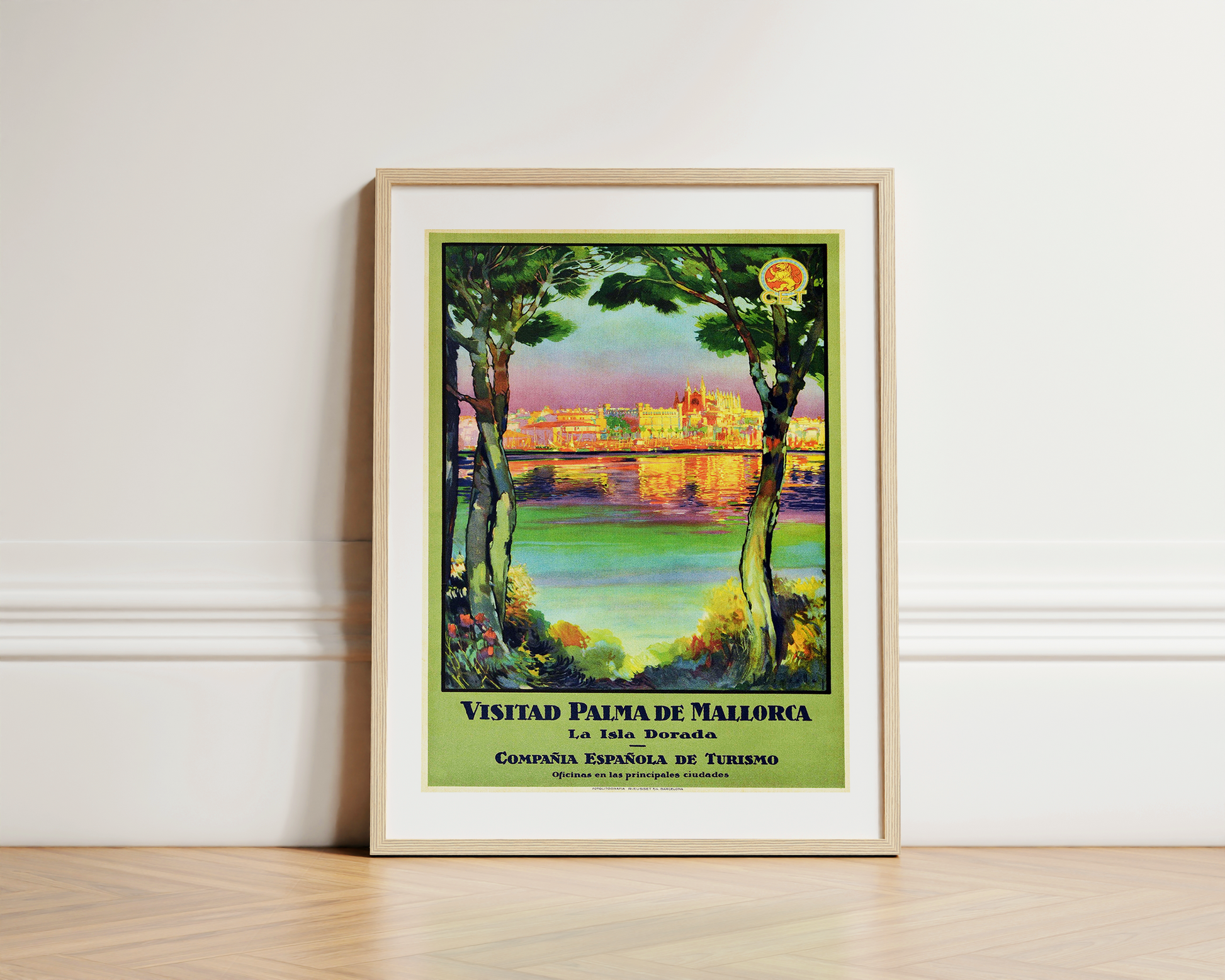 Step back into the golden age of Mallorca tourism with this evocative vintage hotel posters from the early twentieth century. This colorful motif captures the timeless beauty of Palma de Mallorca through the romantic lens of early travel marketing, framing the city and its Cathedral with trees and showing off the beauty of this port city at sunset. Carefully remastered from the original, this poster preserves the authentic vintage aesthetic while ensuring it can be treasured and enjoyed for generations to come, bringing the nostalgic allure of classic Mallorca directly to your walls.