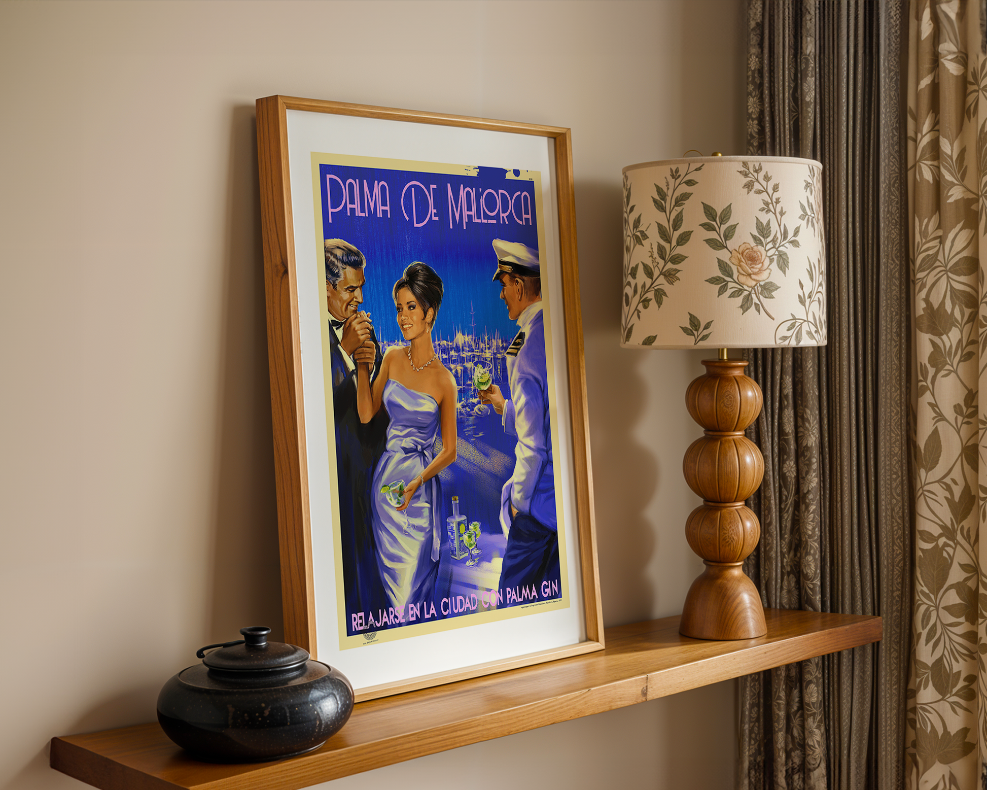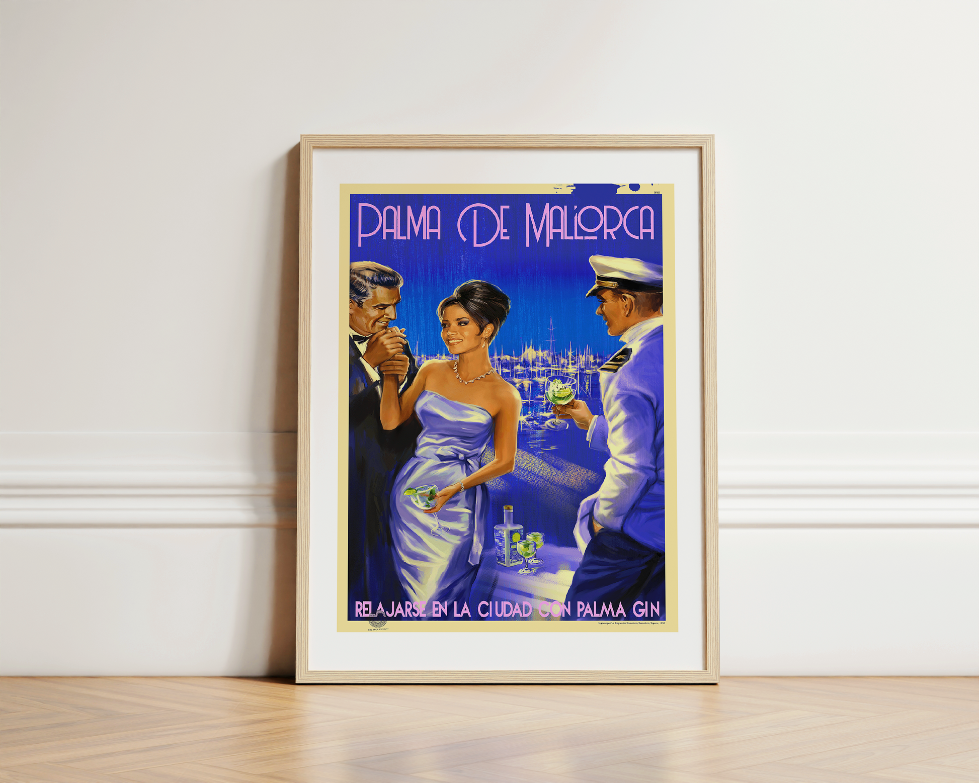 Explore the captivating charm of Palma de Mallorca with Stick No Bills' poster of a girl in a purple dress enjoying a cocktail while two men chat with her. Featuring the picturesque port in the background, this stunning poster is sure to elevate the beauty of any space. Order now to get a glimpse of Palma gin's brand promotion and the town's beauty in this striking blue-toned poster. Buy yours today!