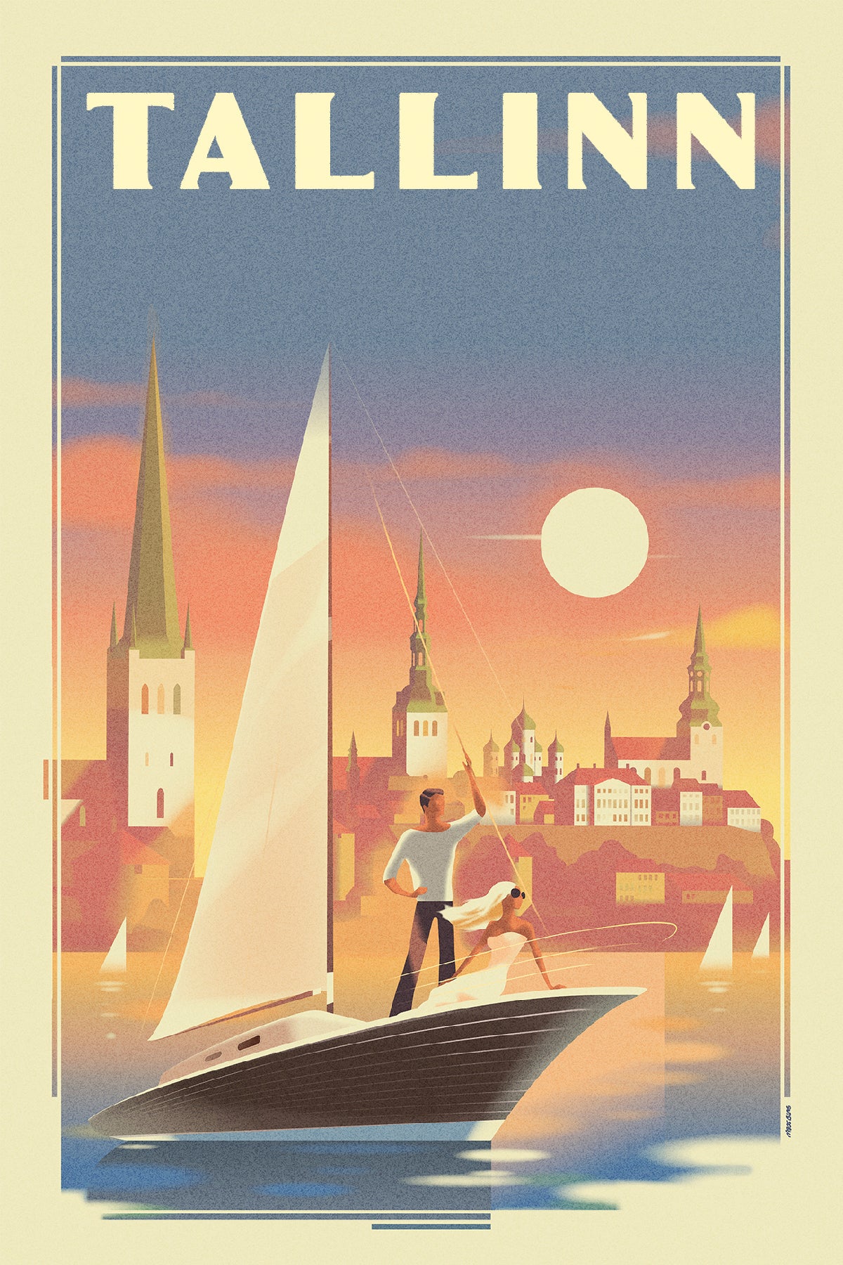 Looking for vintage posters? Check out Stick No Bills' collection! This poster showcases a white sailing boat with a woman and a man floating on beautiful blue waters with the stunning features of Estonia in the background. The sun sets behind them with a pink sky, creating a serene atmosphere. A must-have for any vintage sailing enthusiast, add it to your collection now!