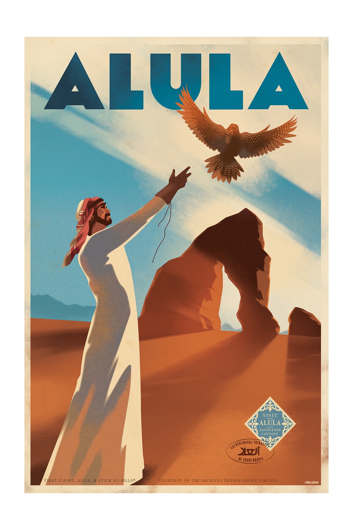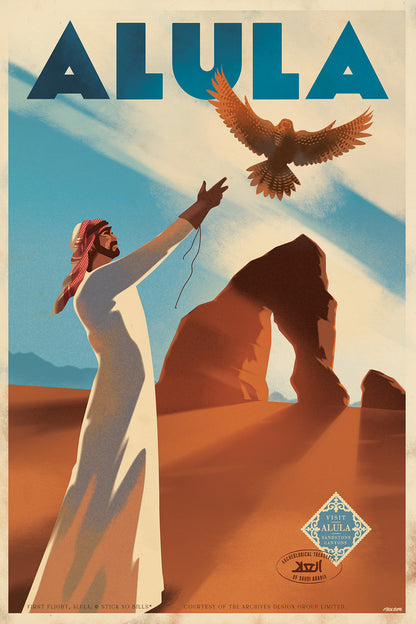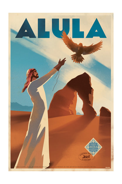 A vintage-style poster depicting Al-Ula, an ancient oasis city in Saudi Arabia, showcasing its dramatic rock formations. Warm desert hues against a bright blue sky define this scene, featuring a man with a majestic hawk against this unique, ancient landscape. This artwork evokes the deep history and cultural heritage of this remarkable region, today a UNESCO World Heritage site. Bring the unique beauty of Al-Ula to your walls.