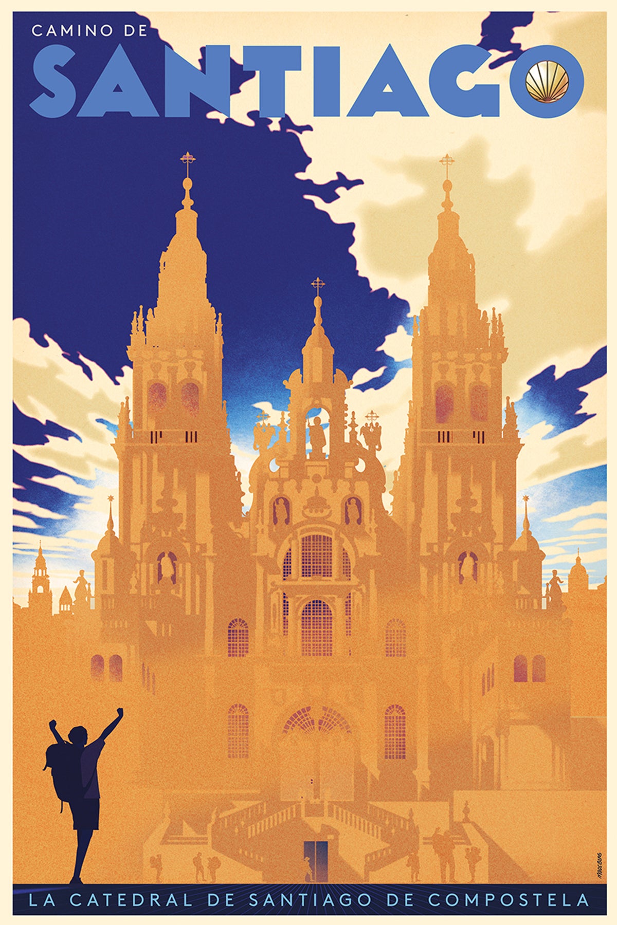 Experience the culmination of your pilgrimage with this stunning vintage-style poster, featuring the majestic Plaza del Obradoiro and the iconic Cathedral of Santiago de Compostela. This evocative artwork captures the profound beauty and historical significance of this location, the heart of the city and the triumphant arrival point for pilgrims journeying from across northern Spain, Portugal, and France. Marvel at the Romanesque origins of the Cathedral, enriched by later Baroque and Gothic additions, rendered in striking deep blues and the warm, earthy tones of Galician stone and sand. A timeless piece celebrating the spirit of El Camino and the enduring allure of Santiago.