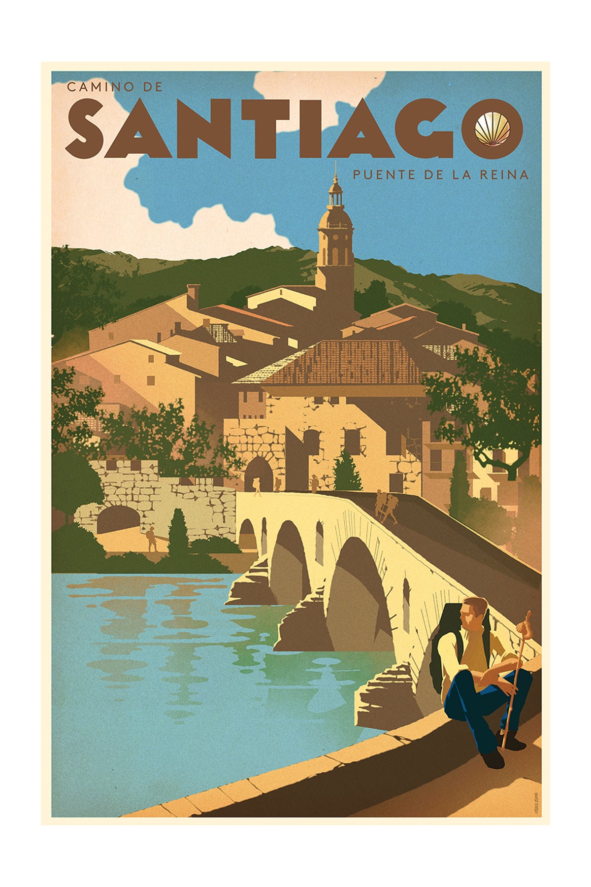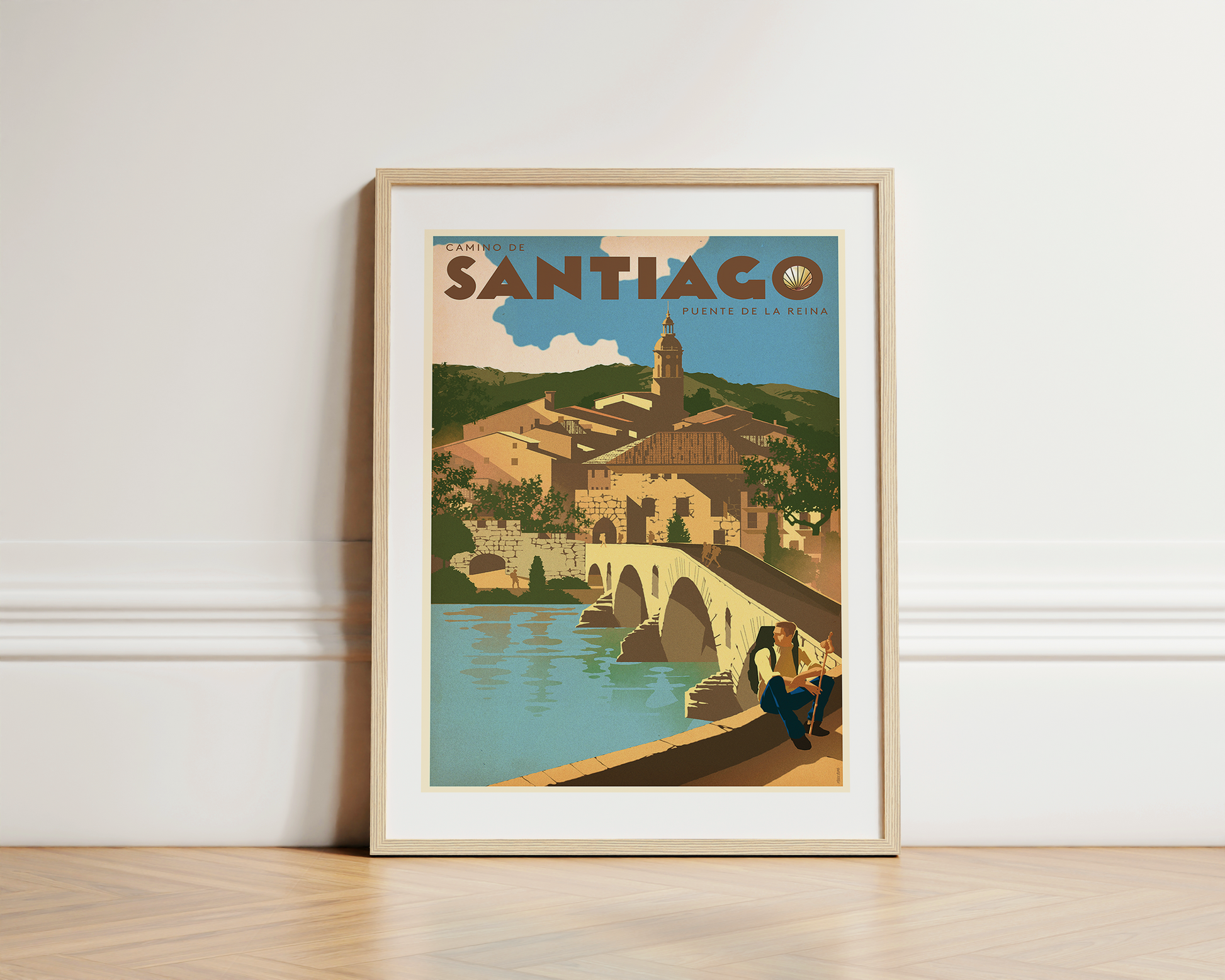 Bask in the sun-drenched beauty of the Puente de la Reina in Navarra, an historic bridge gracing the tranquil river and a vital crossing point on the El Camino to Santiago de Compostela. This vintage-style poster captures the idyllic charm of this historic town, with its stunning architecture and the gentle flow of the river reflecting centuries of pilgrim passage. A reminder of the many beautiful towns and cities along the Camino, this artwork evokes the spirit of the journey and the quiet joy of discovery.