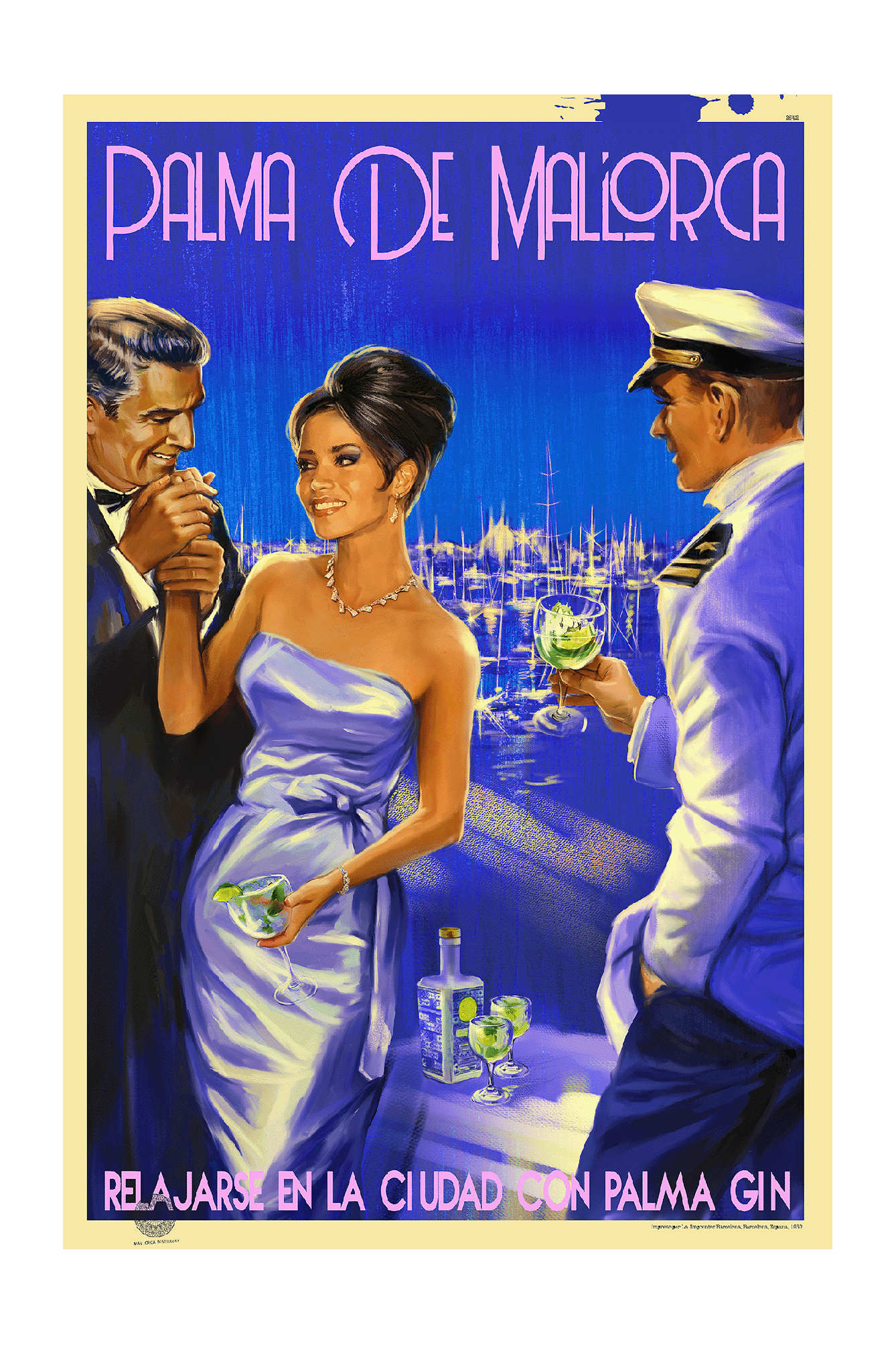 Explore the captivating charm of Palma de Mallorca with Stick No Bills' poster of a girl in a purple dress enjoying a cocktail while two men chat with her. Featuring the picturesque port in the background, this stunning poster is sure to elevate the beauty of any space. Order now to get a glimpse of Palma gin's brand promotion and the town's beauty in this striking blue-toned poster. Buy yours today!