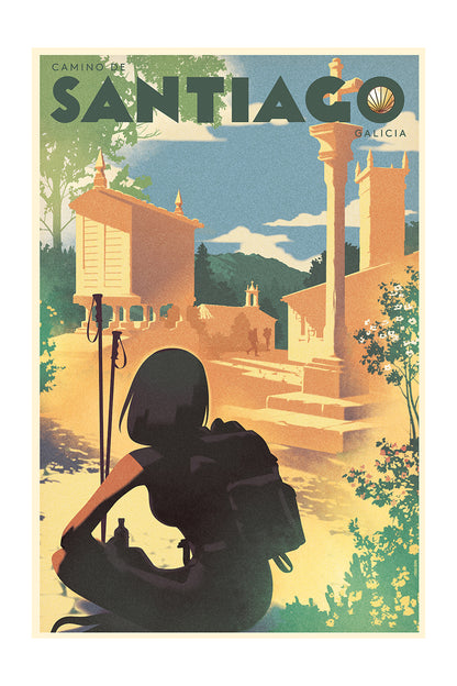 A vintage-style poster artwork capturing a moment of quiet contemplation on the Camino de Santiago. Depicting a resting pilgrim, set against the quintessential Galician landscape of northern Spain. In the background stand two iconic features of local architecture: an hórreo, the distinctive elevated granary built to protect harvests, and a cruceiro, a beautifully carved stone cross often found at crossroads, offering solace and guidance. This piece highlights the unique heritage and peaceful moments found along the path to Santiago de Compostela.