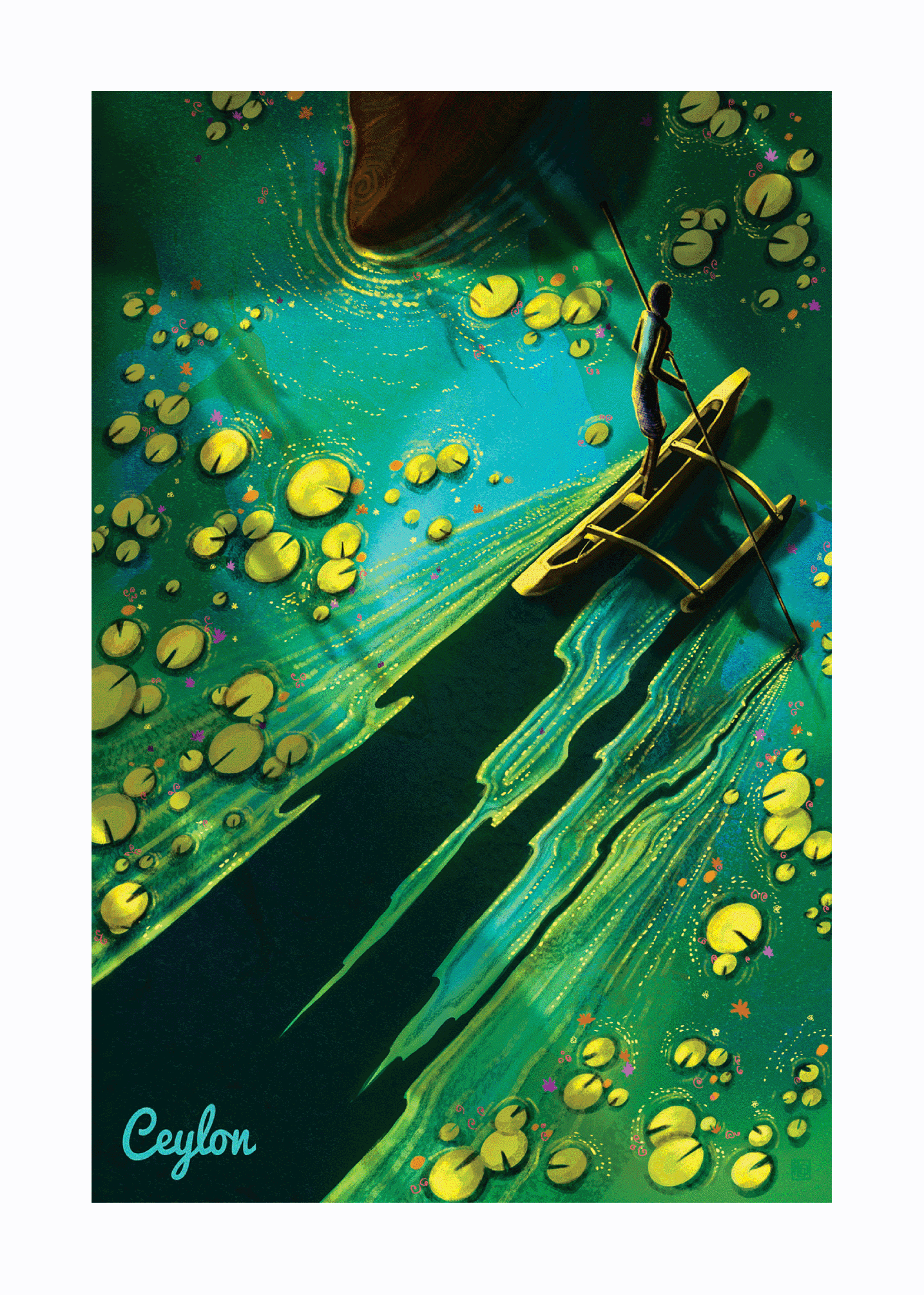 Looking for a poster that captures the beauty of Sri Lanka? Check out our vibrant and captivating poster featuring a person steering a canoe down a river, inspired by the 2014s. With its stunning use of green and yellow tones in different shades, this poster is sure to catch your eye. Shop now at Stick No Bills.