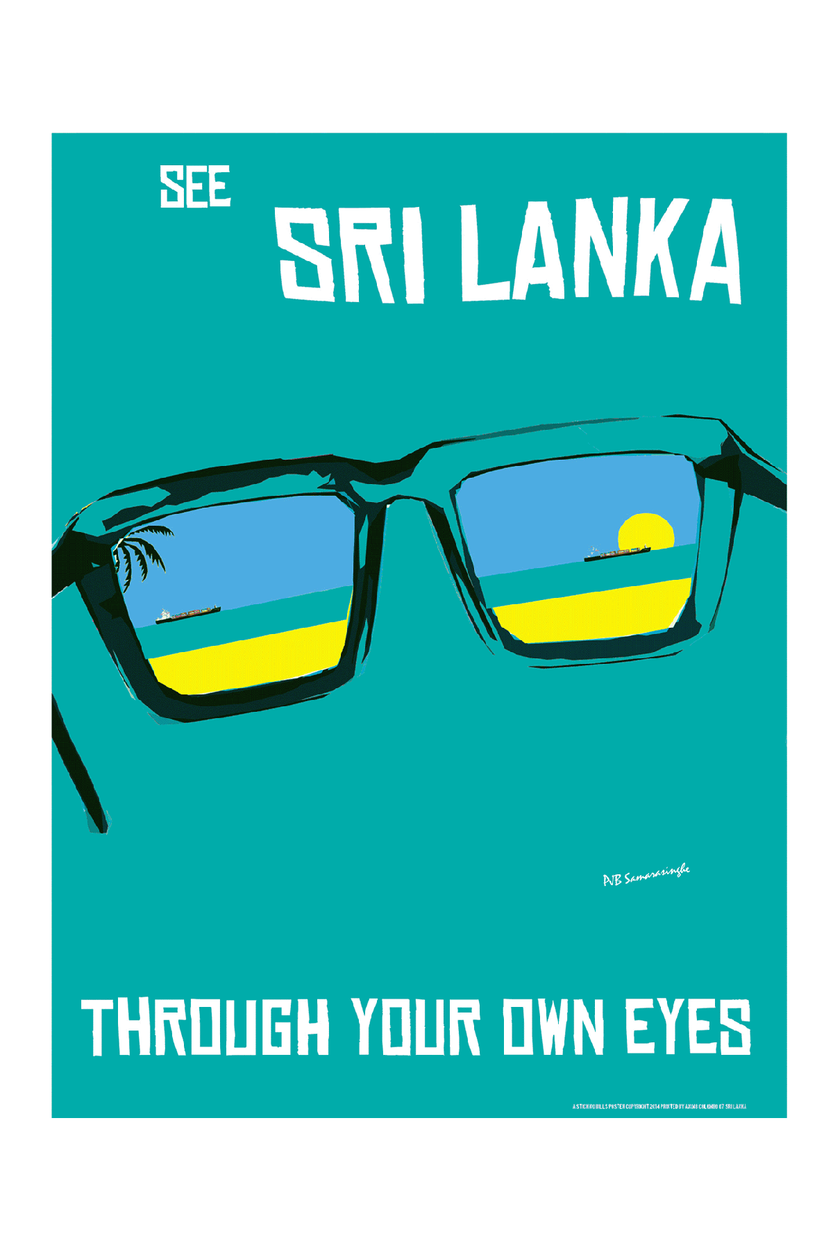 Stick No Bills presents a stunning poster that captures the essence of Sri Lanka in a unique way, with a pair of sunglasses that let you see a picturesque beach scene featuring boats sailing down the water, the sun, and a palm tree. Set against a background of turquoise-blue, the poster inspires you to see the beauty of the island through your own eyes. Perfect for buyers seeking a creative and inspiring piece of art that celebrates the natural beauty of Sri Lanka. Order yours today and discover the wonder of the island!