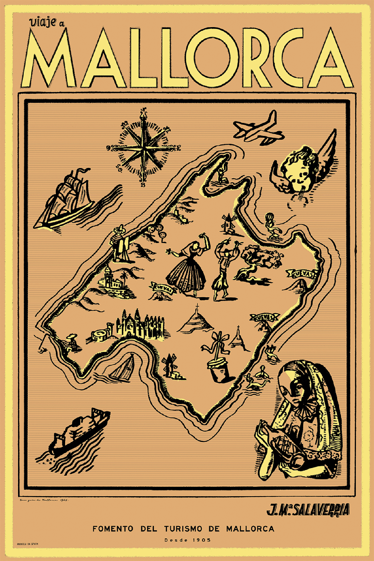 Discover the magic of Mallorca with Stick No Bills' remastered Fomento del Turismo poster, featuring a stunning map of the island in purple, yellow, and blue. Perfect for buyers seeking a touch of vintage charm, this poster captures the essence of the island's history and culture, with a compass, plane, boat and other unique features. Inspired by the 1950s, this piece is a must-have for any collector or enthusiast. Order now and bring the beauty of Mallorca into your home or office!